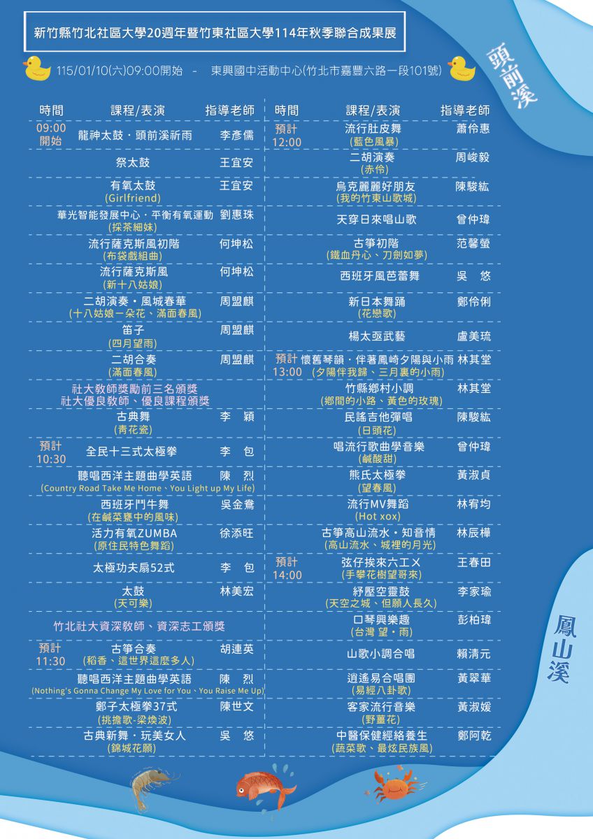 請帶著您的家人與朋友,一起來逛攤位、看表演、拿大獎!讓我們在歡笑與感動中,共同見證竹北社大 20 年的璀璨成果,共度難忘的美好時光。