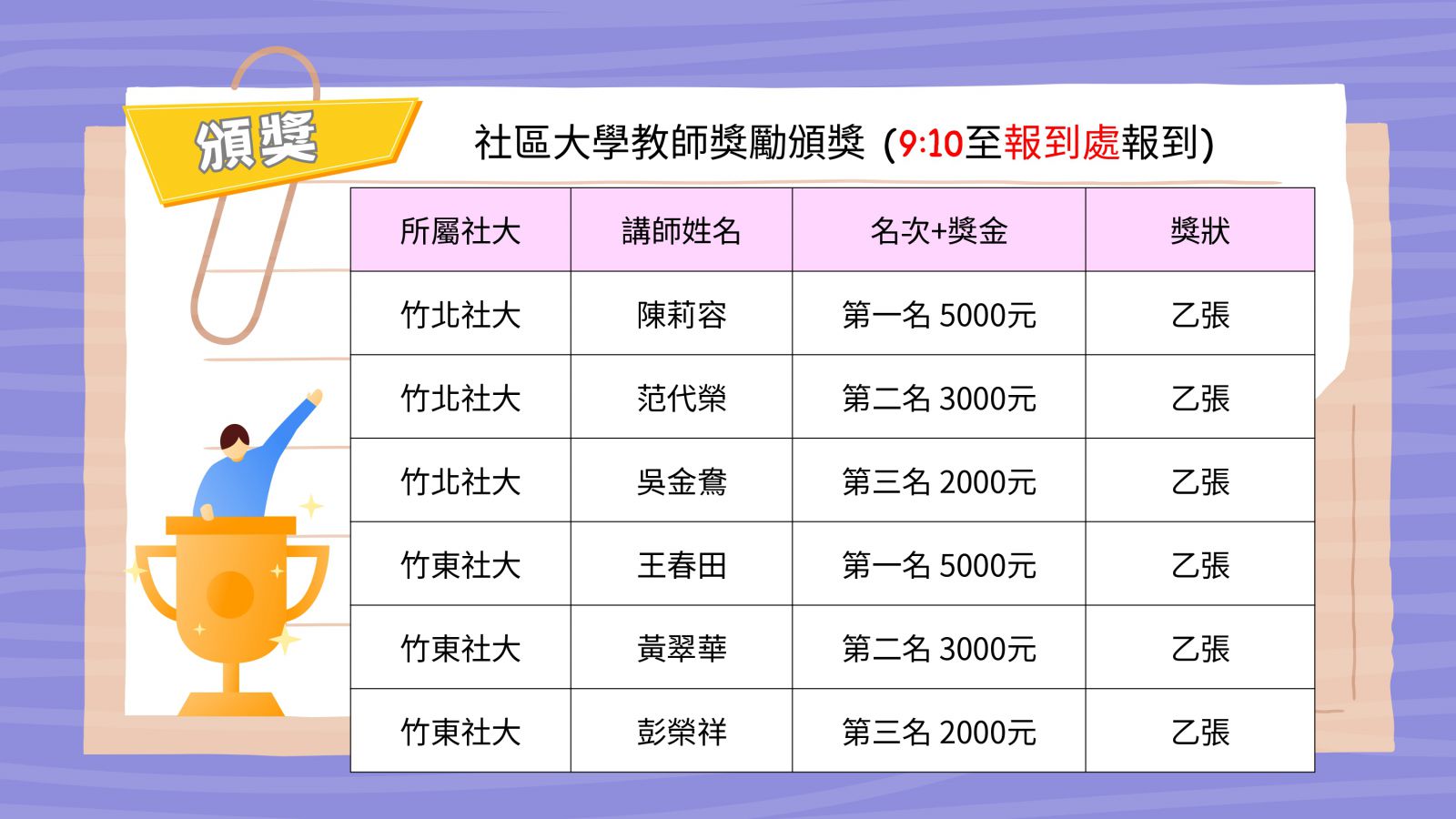 社區大學教師獎勵頒獎:根據「新竹縣社區大學教師獎勵辦法」,教師在教材教法、行政配合度、教學成果、公共參與等面向獲選卓越成績。頒發獎狀及獎金,以資鼓勵。