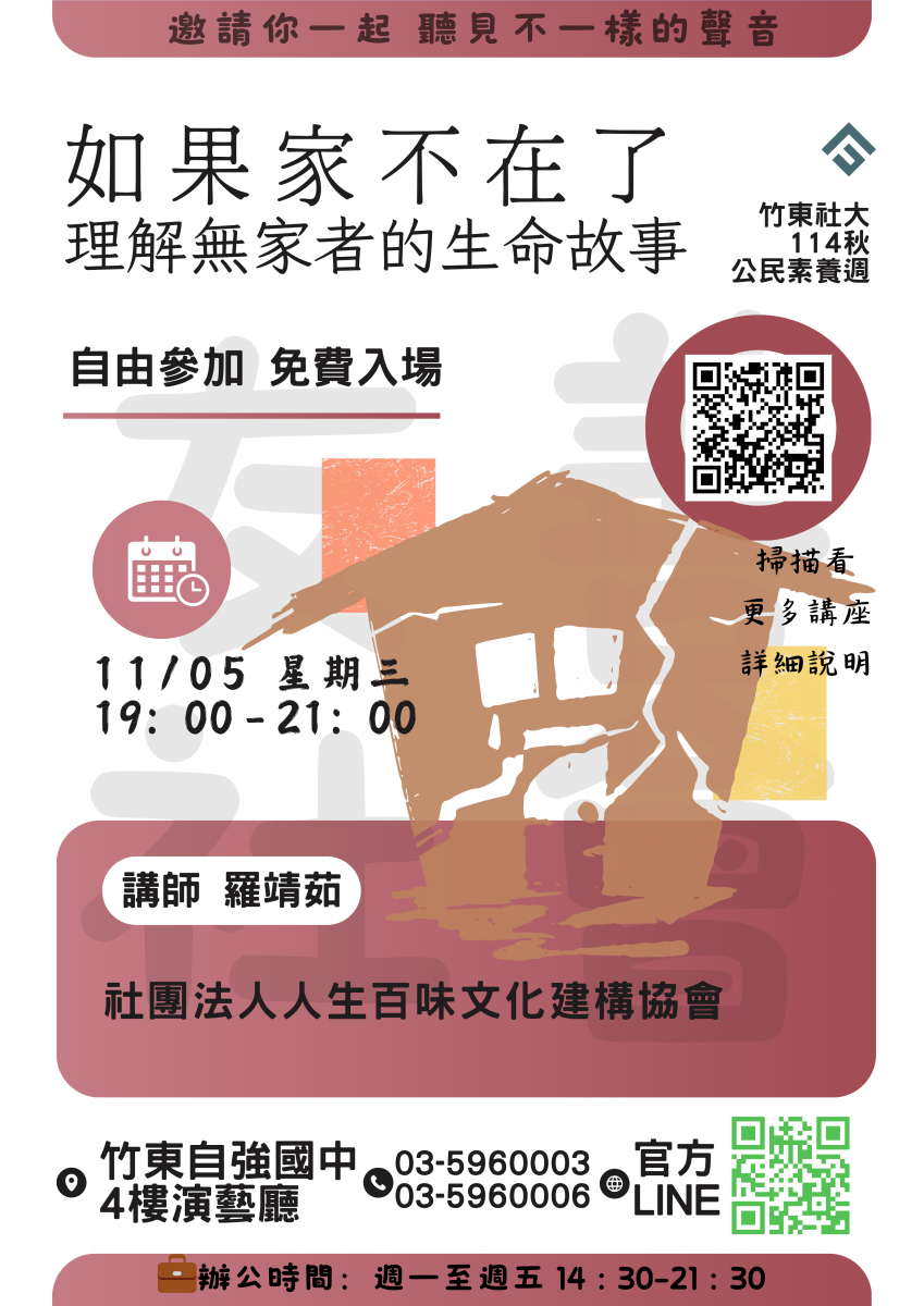 活動日期:114年11月05日(三) 引導學員重新認識無家者的處境與生命歷程。以「家」為主題切入,透過共感性的提問與故事分享,讓參與者思考:我們與露宿街頭者的距離,真的那麼遙遠嗎?透過講座認識無家議題的多元面貌,並破除社會對無家者的刻板印象。藉由生命故事的呈現,更激發同理心與社會責任感,促進社會包容。 |